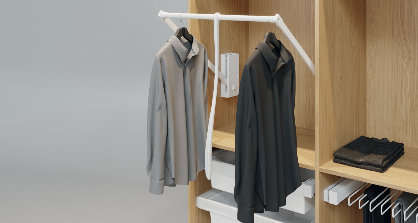 Lift haine Häfele Dresscode, 600 - 1000 mm, 10 kg, alb RAL 9016 este soluția practică pentru organizarea spațiului din dulapurile înalte, oferind acces rapid și comod la hainele depozitate sus. Sistemul coboară bara de umerașe la îndemână printr-o simplă tragere, eliminând nevoia de scaune sau alte improvizații.