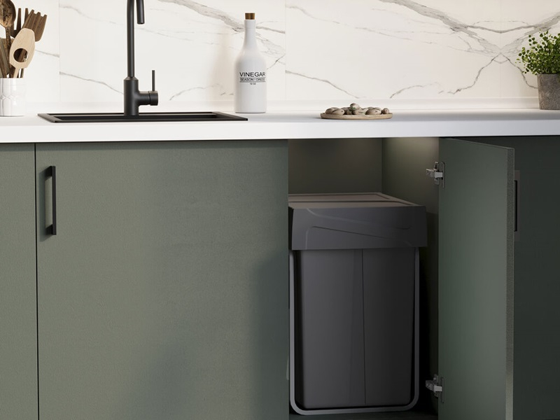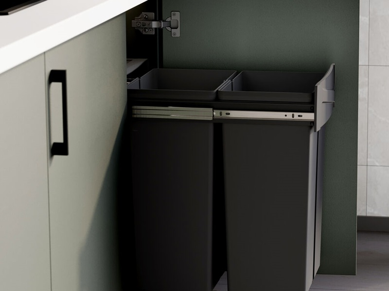Coș de gunoi glisant pentru bucătărie 2x25L, gri antracit este o soluție practică pentru colectarea și sortarea deșeurilor direct în mobilierul de bucătărie. Sistemul este conceput pentru montaj în interiorul corpului de mobilier, oferind acces rapid la recipiente și menținând spațiul din bucătărie ordonat.