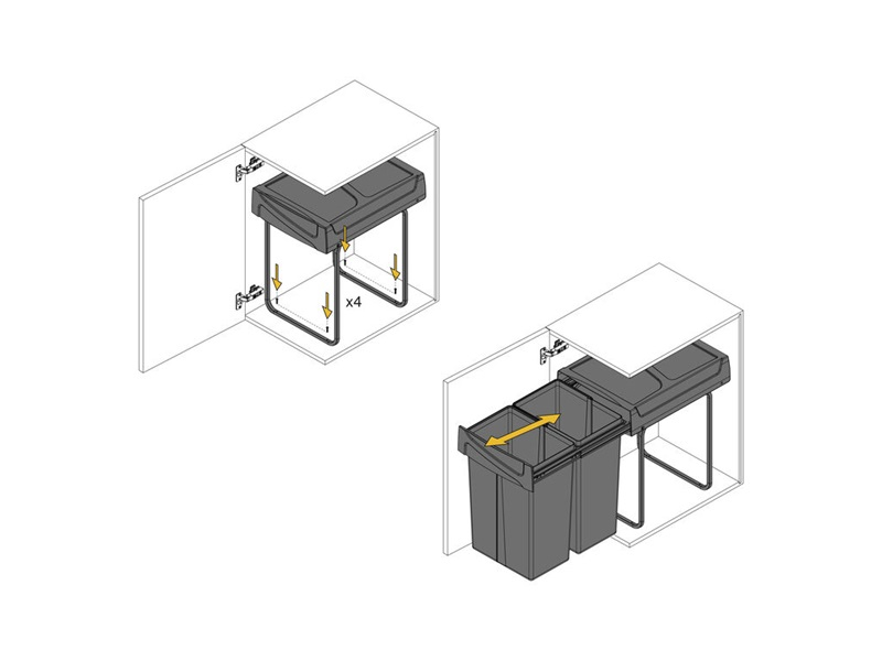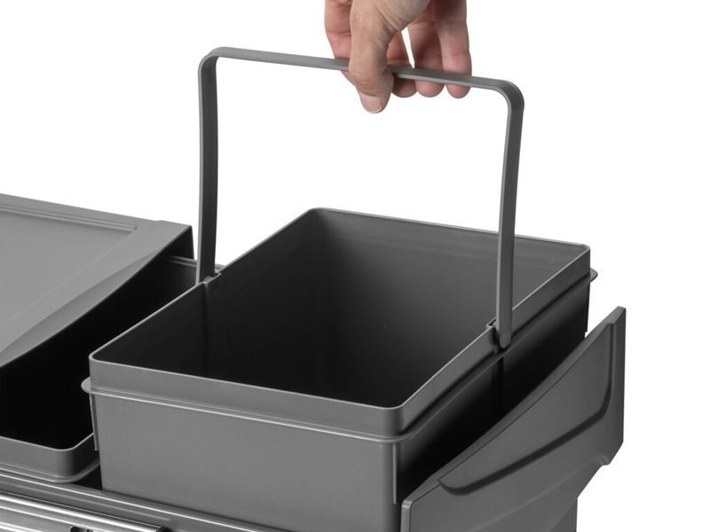 Setul include două recipiente detașabile de câte 25 litri, ideale pentru separarea deșeurilor menajere sau pentru reciclare. Fiecare container este prevăzut cu mâner pentru scoatere rapidă și golire ușoară. Construcția combină o structură din oțel cu recipiente din plastic rezistent, finisate într-o nuanță gri antracit care se potrivește perfect în interiorul mobilierului de bucătărie.